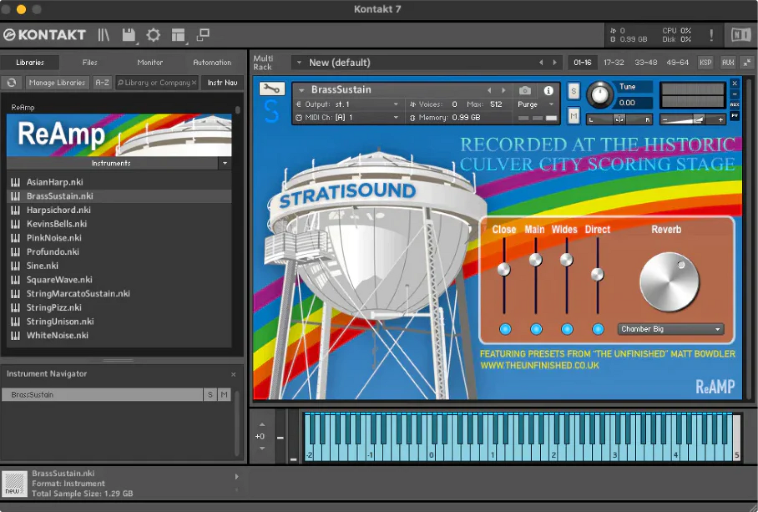 ReAmp is free to all customers who have made a paid purchase at Stratisound.com. As the name implies, ReAmp is re-amped library of the highest quality programmed for Native Instrument’s Free Kontakt Player, and recorded at the world-famous “Culver City Scoring Stage” (its actual proper name withheld for Copyright reasons). ReAmping is a recording technique where you take an audio source, usually one that is computer generated or has been recorded in a small space and broadcast it into a live room, preferably a large and great-sounding space. You then re-record the signal of that broadcast just like you would any live musician in the space, with the idea being it will sound much more natural and “blendy” than any reverb ever could. In this instance, we re-recorded the signal with three pairs of stereo microphones (DPA 4011s, Sennheiser MKH 800’s and Schoeps MK2’s). It is a high-end technique that has been used by many artists, possibly non more famous than Michael Jackson. Here is an interview where Jackson’s recording engineer, Bruce Swedien, talks about the technique in detail. The “Historic Culver City Scoring Stage” is one of the best-sounding rooms in the United States and is particularly well suited for ReAmping due to its neutral and dense sonic characteristics.